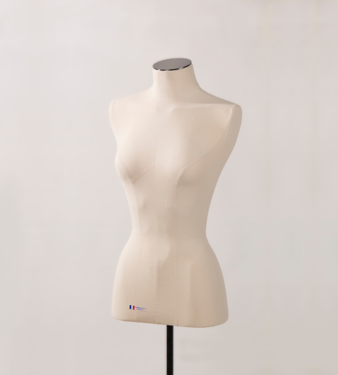Idéal pour les ateliers de couture ou pour l'exposition en vitrine, ce mannequin est conçu pour un travail de précision et une présentation élégante. Recouvert d'un tissu beige de haute qualité, il offre une surface parfaite pour épingler, ajuster et draper vos créations.